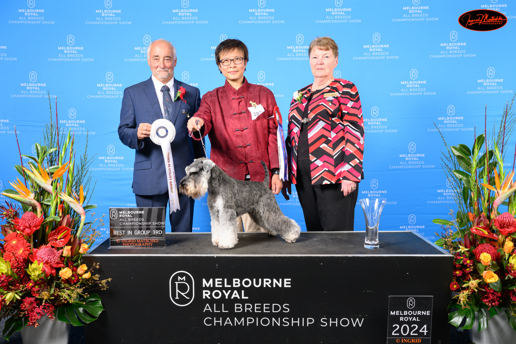 Hero is Singapore Reserve Best Miniature Schnauzer (his father was No.1) and Third Best Dog Group 2 in Year 2023. He is an All Breeds Multiple Best In Show and Multiple Best In Specialty show winner in Australia and has won multiple Best In Groups and General Specials Win. He has attained his Australian Champion title in less than 3 months of showing and has attained his Supreme within 1 year of showing in Australia.